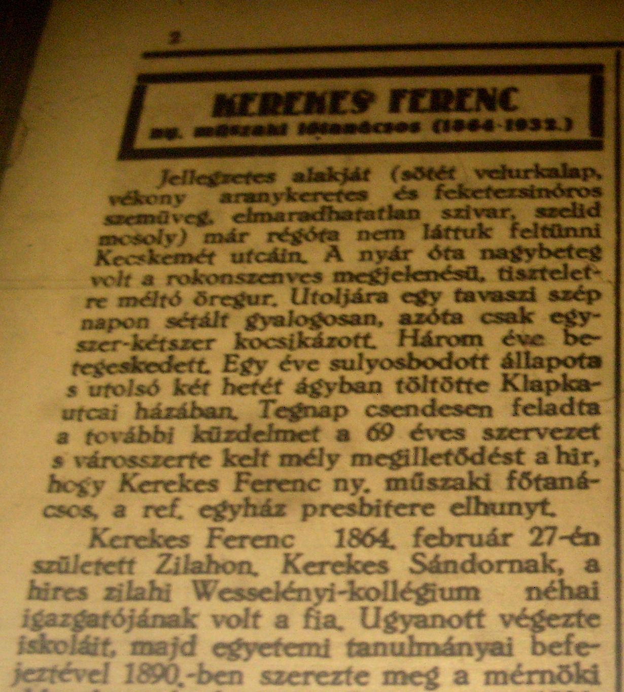 Ma történt - 2014. február 27.150 éve, 1864. február 27-én Zilahon született Kerekes Ferenc városi főmérnök, műszaki főtanácsos, református egyháztanácsos. Kerekes Sándornak, a híres zilahi Wesselényi-kollégium néhai igazgatójának a fia volt. Iskoláit szülővárosában végezte, majd egyetemi tanulmányai befejeztével 1890. május 28-án szerezte meg a mérnöki oklevelet a budapesti műegyetemen. 1891 októberében állt Kecskemét város szolgálatába. Mérnökké, majd 1896-ban főmérnökké választották. Egyik legfontosabb feladatát 1897-ben kapta, a városi tanács új városrendezési terv kidolgozását rendelte el. Kerekes Ferenc munkáját a következő szempontok vezérelték: a városhoz méltó főtér kialakítása, az egykori városárkok helyén körutak kiépítése, a belterület bővítése és a főtérre beérkező utaknak széles, egyenes irányú kijelölése. A terv a belterületet 583 katasztrális holdról 1286 holdra bővítette. A városszabályozási rendeletet a közgyűlés többszöri átdolgozás után 1908. február 27-én, míg az erre épülő építkezési szabályrendeletet 1909. március 31-én fogadta el. Ez a városszabályozási és építési szabályrendelet 1913-ig volt érvényben. Kerekes Ferenc iskolai munkák megvalósításában is részt vett. Az 1800-as évek végén ő tervezte a polgári leányiskolát. A református egyház ügyeivel is buzgón foglalkozott. 1906 decemberében a gyülekezet által alapított Építésügyi Bizottság tagjává választották. Az Újkollégium építése alatt főmérnöki tisztet töltött be.